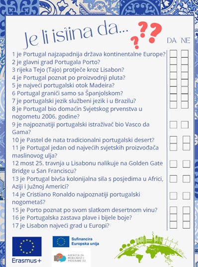 Održan je još jedan sastanak u okviru priprema za predstojeću mobilnost učenika u Portugalu. Sastanku su prisustvovali sudionici kratkoročne mobilnosti (8 učenika trećih i četvrtog razreda usmjerenja prodavač i komercijalist) i nastavnice u pratnji Irena Velkavrh i Helena Mišković, zajedno s projektnim timom. Sudionici su nakon samostalnih priprema uspješno riješili kviz pitanja o poznavanju Portugala, a sve u sklopu geografske, kulturološke i pedagoške pripreme za predstojeću mobilnost. Strukovna priprema odvija se u sklopu redovne nastave te praktične nastave na koju učenici odlaze van škole. Učenici redovno odrađuju i jezičnu pripremu u trajanju od najmanje 20 sati putem Online Language Support platforme te dodatnih aplikacija za učenje stranih jezika. Učenicima je, nakon dogovora s partnerima u Portugalu, detaljnije predstavljen program predstojećih aktivnosti (rad u partnerskim tvrtkama u Barcelosu, kampus u kojem će boraviti, pravila ponašanja, pripreme za putovanje, vođenje dnevnika rada).
